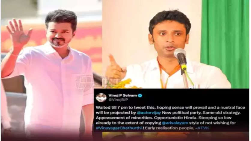 இந்நிலையில், விநாயகர் சதுர்த்திக்கு விஜய் வாழ்த்து சொல்லவில்லை என ட்வீட் செய்துள்ளார் பாஜக பிரமுகரான வினோஜ் பி செல்வம். இதுதொடர்பாக அவர் வெளியிட்டுள்ள எக்ஸ் பதிவில்," இந்த ட்வீட்டை போடுவதற்காக இரவு ஏழு மணி வரை காத்திருந்தேன்.. புதிய கட்சி தொடங்கி இருக்கும் விஜய் விநாயகர் சதுர்த்திக்கு வாழ்த்து சொல்வார் என எதிர்பார்த்தேன். ஆனால் சொல்லவில்லை.. சிறுபான்மையினர் மக்களை குஷிப்படுத்தும் அதே பழைய தந்திரத்தை விஜய் கடை பிடித்து இருக்கிறார். திமுகவை காப்பியடிக்கும் அளவுக்கு விஜய் தரம் தாழ்ந்து போயிருக்கிறார்.. மக்கள் சிந்திக்க வேண்டும்" என பதிவிட்டுள்ளார்.