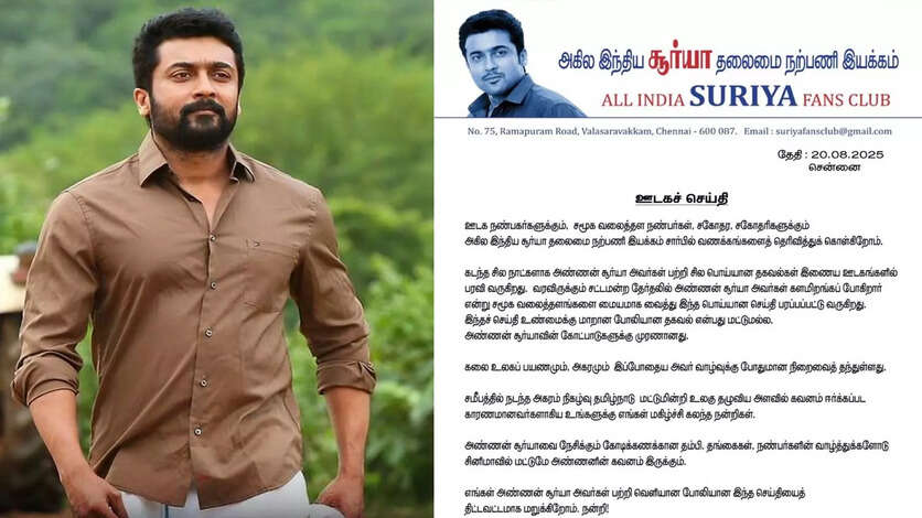 எங்கள் அண்ணன் சூர்யா அவர்கள் பற்றி வெளியான போலியான இந்த செய்தியைத் திட்டவட்டமாக மறுக்கிறோம். நன்றி!" என்று தெரிவிக்கப்பட்டுள்ளது.