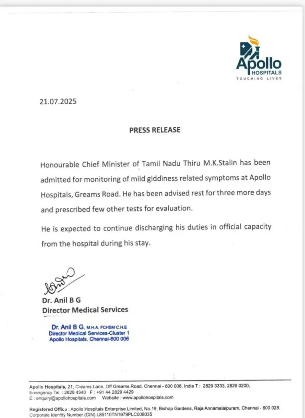 இந்நிலையில், முதல்வர் ஸ்டாலினின் உடல்நிலை தொடர்பாக அப்போலோ ஹாஸ்பிடல் நிர்வாகம் புதிய அறிக்கையை வெளியிட்டுள்ளது.