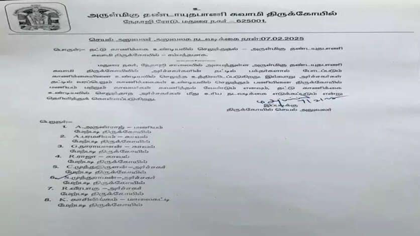 இது இந்து சமய அறநிலையத்துறை கட்டுப்பாட்டிலும் உள்ளது. இந்த நிலையில் பாலதண்டாயுத சுவாமி திருக்கோவில் அறங்காவலர் செயல் அலுவலர் சுற்றறிக்கை ஒன்றை அனுப்பி வைத்துள்ளார்.
