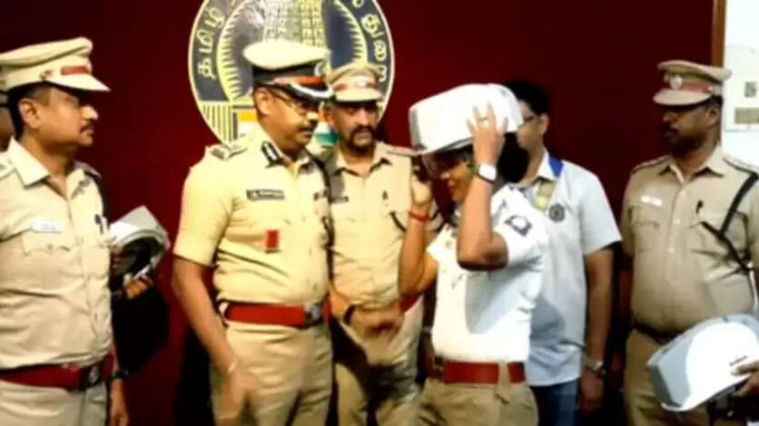 போக்குவரத்து காவலர்களுக்கு குளிரூட்டப்பட்ட தலைக்கவசத்தை மாநகர காவல் ஆணைய் சரவண சுந்தர் வழங்கினார்.