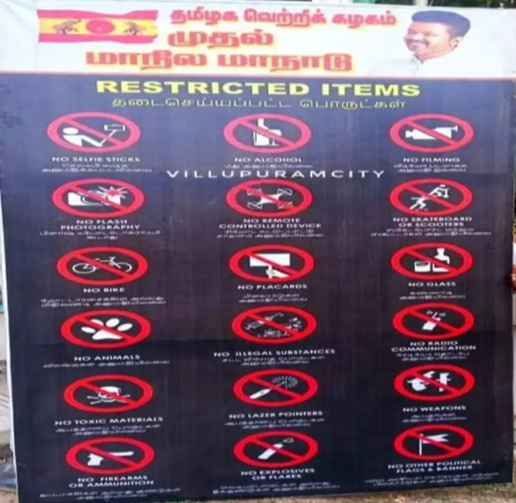 இந்நிலையில் விக்கிரவாண்டியில் நாளை (அக்.27) நடைபெறும் தவெக மாநாட்டுக்கு வருவோருக்கு பல்வேறு கட்டுப்பாடுகள் விதிக்கப்பட்டுள்ளது. அதில், 'மாநாட்டிற்கு வருவோர், மற்ற அரசியல் கட்சிகளின் கொடிகள், பேனர்களை எடுத்து வரக்கூடாது. செல்ஃபி ஸ்டிக் பயன்படுத்தக் கூடாது, காணொளி, ஃபிளாஷ் பயன்படுத்தி போட்டோ எடுக்க அனுமதி இல்லை. மது அருந்திவிட்டு வரக்கூடாது, சட்டவிரோத பொருட்களை கொண்டு வரக் கூடாது' என தெரிவிக்கப்பட்டுள்ளது.