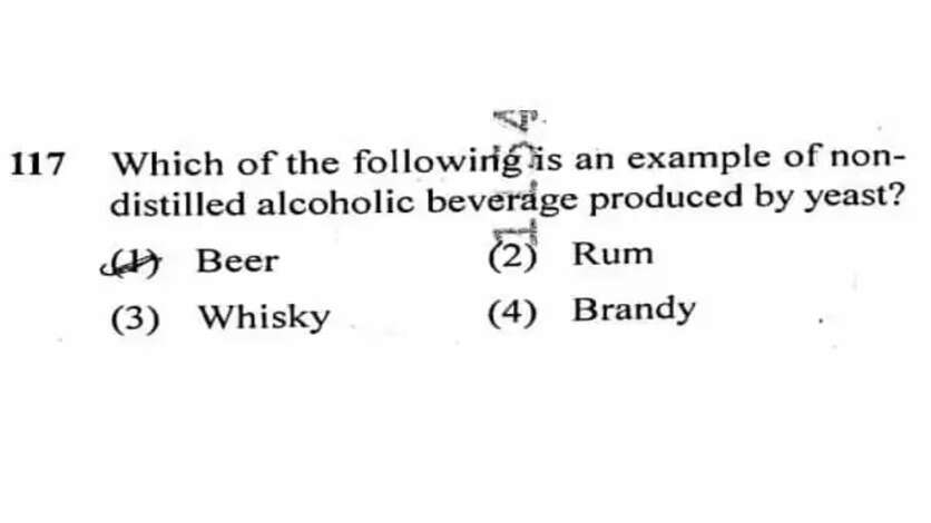வினாத்தாளில் 117 வது கேள்வியாக 'ஈஸ்ட்'டால் தயாரிக்கப்படும் ஆல்கஹால் இல்லாத மதுபானம்' என்ற கேள்விக்கு பீர், ரம், பிராந்தி, விஸ்கி என விடைகள் கொடுத்து சரியானதைத் தேர்வு செய்யும் வகையில் கேட்கப்பட்டிருந்தது. இக்கேள்விக்கு விடை 'பீர்' என எழுதினால் 4 மதிப்பெண்கள்.
