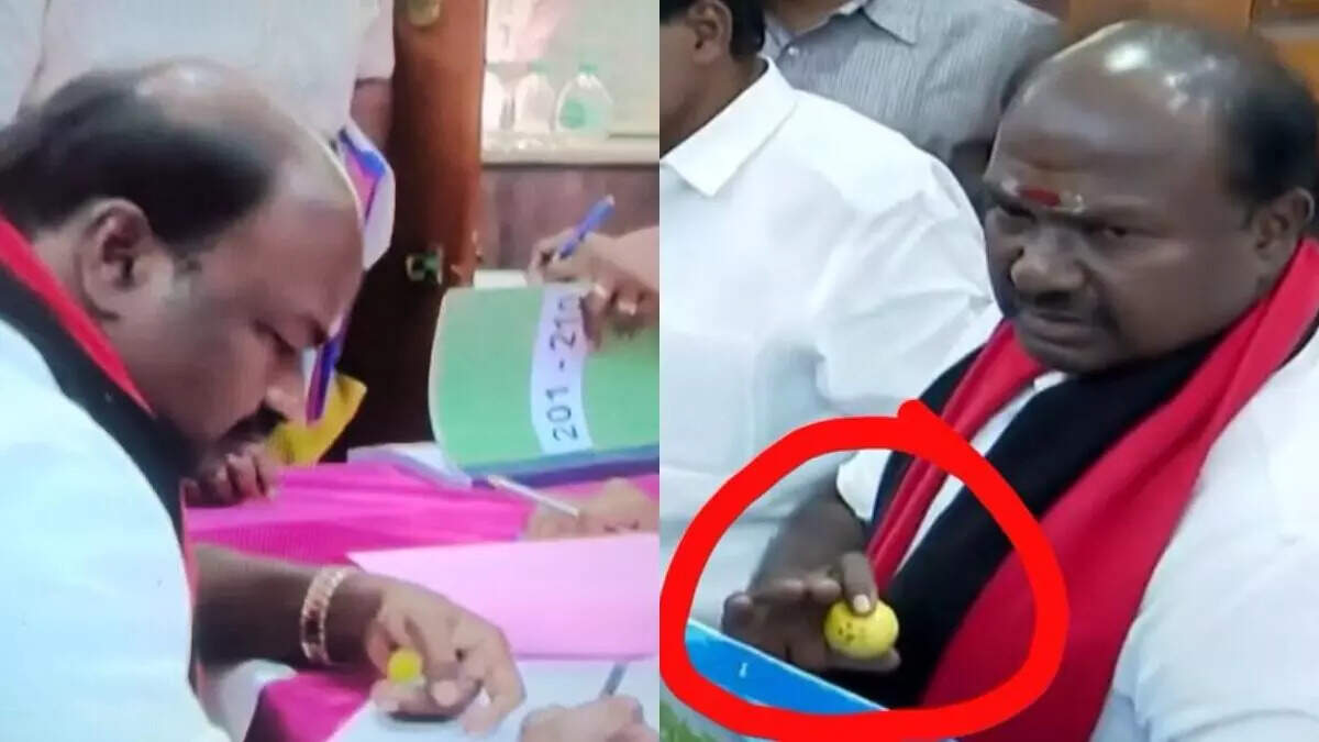 திமுக வேட்பாளர் வி.சி.சந்திரகுமார், வேட்பு மனு தாக்கல் செய்ய வந்தபோது, கையில் எலுமிச்சம்பழம் ஒன்றை வைத்திருந்தார்.காரிலிருந்து இறங்கும்போதே, அதனைக் கையில் வைத்திருந்த அவர், வேட்பு மனு தாக்கல் செய்யும்போதும், கையெழுத்திடும்போதும் தனது கையிலேயே வைத்திருந்தார்.