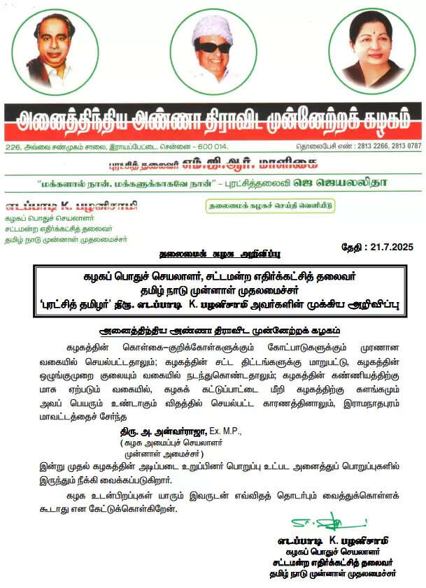 கழகக் கட்டுப்பாட்டை மீறி கழகத்திற்கு களங்கமும் அவப் பெயரும் உண்டாகும் விதத்தில் செயல்பட்ட காரணத்தினாலும், இராமநாதபுரம் மாவட்டத்தைச் சேர்ந்த திரு. அ. அன்வர்ராஜா, Ex. M.P (கழக அமைப்பு செயலாளர், முன்னாள் அமைச்சர் )இன்று முதல் கழகத்தின் அடிப்படை உறுப்பினர் பொறுப்பு உட்பட அனைத்துப் பொறுப்புகளில் இருந்தும் நீக்கி வைக்கப்படுகிறார். கழக உடன்பிறப்புகள் யாரும் இவருடன் எவ்விதத் தொடர்பும் வைத்துக்கொள்ளக் கூடாது என கேட்டுக்கொள்கிறேன்.