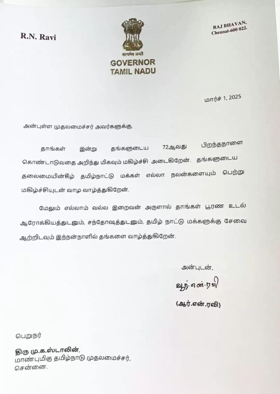 மேலும் எல்லாம் வல்ல இறைவன் அருளால் தாங்கள் பூரண உடல் ஆரோக்கியத்துடனும், சந்தோஷத்துடனும், தமிழ்நாட்டு மக்களுக்கு சேவை ஆற்றிடவும் இந்நன்நாளில் தங்களை வாழ்த்துகிறேன்" என்று கடிதத்தில் குறிப்பிடப்பட்டுள்ளது. மேலும் ஆளுநர் ஆர்.என். ரவி அந்த வாழ்த்து கடிதத்தில் தமிழில் கையொப்பமிட்டுள்ளார்.