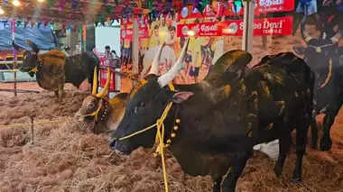 கோவை காந்திபுரம் பகுதியில் அணிவகுத்து நிற்கும் ஜல்லிக்கட்டு காளைகள்!