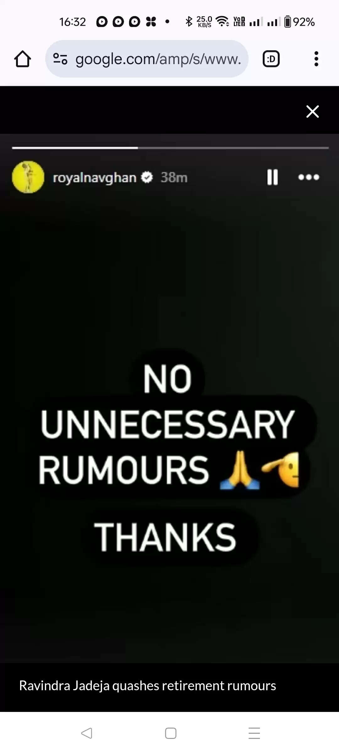 இந்நிலையில் இதற்கு முற்றுப்புள்ளி வைக்கும் வகையில் ஜடேஜா தனது இன்ஸ்டாகிராம் பக்கத்தில், "தேவையற்ற வதந்திகளை பரப்ப வேண்டாம்" என பதிவிட்டுள்ளார். இதன் மூலம் அவர் ஓய்வு பெறவில்லை என்பது உறுதியாகியுள்ளது.