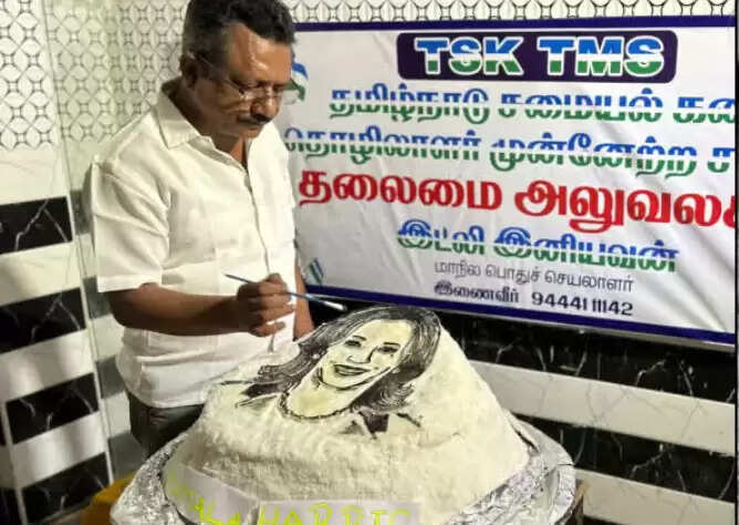 இதுபற்றி சங்க தலைவர் இட்லி இனியவன் கூறுகையில், ''இந்தியாவின் தமிழகத்தை சேர்ந்த கமலா ஹாரிஸ், அமெரிக்க அதிபர் தேர்தலில் போட்டியிட்டுள்ளார். அவர் வெற்றி பெறுவார் என்ற நம்பிக்கையின் அடிப்படையில், தமிழ்நாடு சமையல் கலை நிறுவனம் தயார் செய்துள்ளது. 50 கிலோ எடையுள்ள இட்லி மற்றும் அதில் கமலா ஹாரிஸின் படத்தை வடிவமைத்துள்ளார்.