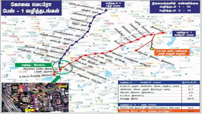 அவிநாசி சாலை, சத்தி சாலை ஆகிய வழித்தடங்களில் மொத்தம் 39 கிலோ மீட்டர் தூரத்துக்கு மெட்ரோ ரயில் திட்டம் செயல்படுத்தப்படும்.
