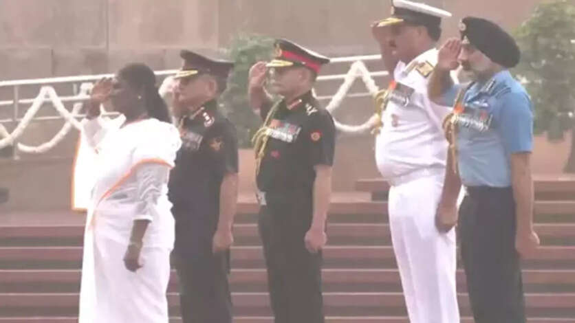 ஜனாதிபதி திரவுபதி முர்முவுடன் முப்படை தளபதிகளும் மரியாதை செலுத்தினர். அவர்களை தொடர்ந்து மத்திய பாதுகாப்பு மந்திரி ராஜ்நாத் சிங், இணை மந்திரி சஞ்சய் சேத் மரியாதை ஆகியோரும் மரியாதை செலுத்தினர்.