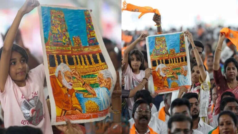 அப்போது, கூட்டத்தில் இருந்த சிறுமி ஒருவர், தனது கையில் பிரதமர் மோடியின் தாயின் படத்தை உயர்த்திப் பிடித்துக் காட்டியபடி இருந்தார்.
