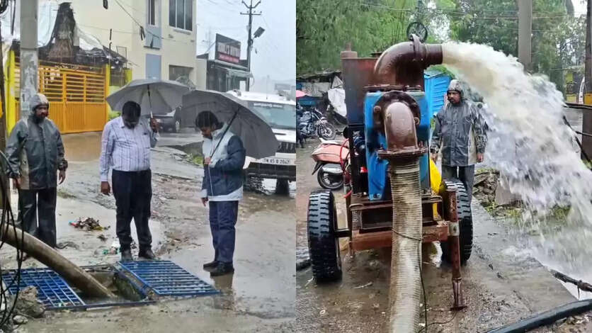 சாலையில் தேங்கிய மழைநீர்; பணியில் மாநகராட்சி ஊழியர்கள்!