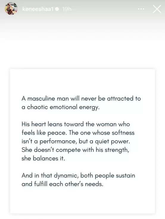 அதில், ”ஒரு ஆண் கலவரமான உணர்ச்சிகளை கொண்ட பெண்ணிடம் ஈர்க்கப்பட மாட்டார். அவருக்கு அமைதி கொடுக்கும் பெண்ணிடமே அவரது இதயம் செல்லும். அந்த பெண்ணின் கனிவு என்பது ஒரு பாவனையாக இருக்காது. அது ஒரு பெரிய சக்தியாக இருக்கும். அவள் அவனது வலிமையுடன் போட்டியிடவில்லை, அவள் அதை சமநிலைப்படுத்துகிறாள். அப்படி இருக்கையில் இருவரும் அவரவர்களின் தேவைகளை பூர்த்தி செய்வார்கள்’ என தெரிவித்துள்ளார்.