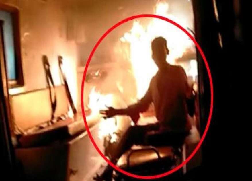 பத்மாவதி டவர்ஸ் அருகே சென்றபோது சுரேஷ், தன்னிடமிருந்த தீப்பெட்டி மூலம் ஆம்புலன்சுக்கு தீ வைத்தார். அப்போது, ஆம்புலன்சில் இருந்த கிருமிநாசினியில் பற்றிய தீ ஆம்புலன்ஸ் முழுவதும் பற்றி எரிந்தது. போலீசார் வெளியில் குதித்து தப்பினர்.