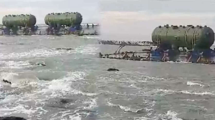 இந்நிலையில் கடலில் காற்றின் வேகம் அதிகரித்துள்ளதால் மிதவை கப்பலில் விரிசல் ஏற்பட்டு சேதம் அடைந்துள்ளது. இதனால் அந்த கப்பல் மெல்ல மெல்ல கடலில் மூழ்க தொடங்கி உள்ளதால், நீராவி கொள்கலன்களும் கடலில் சரிந்து விழும் அபாயம் ஏற்பட்டுள்ளது. அணு உலை வளாகத்தில் இருந்து சுமார் 150 மீட்டர் தூரத்தில் மிதவை கப்பல் தரை தட்டி நிற்கிறது. இதனால் சாலை அமைத்து ராட்சத கிரேன் மூலமாக கொள்கலனை மீட்க முடிவு செய்யப்பட்டது.