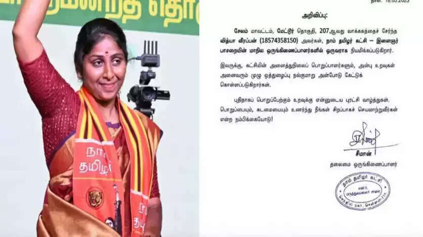 வித்யாராணிக்கு நாதக மாநில இளைஞர் பாசறை ஒருங்கிணைப்பாளர் பதவி அளிக்கப்பட்டுள்ளது.