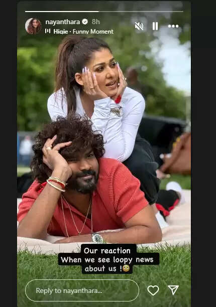 இந்தநிலையில் தங்கள் மீதான வதந்திகளுக்கு பதிலளிக்கும் வகையில் நயன்தாரா ஒரு பதிவை போட்டுள்ளார்.அவர் தனது இன்ஸ்டா ஸ்டோரியில், விக்னேஷ் சிவனுடன் வேடிக்கைப் பார்க்கும் கோணத்தில் எடுத்துக்கொண்ட புகைப்படத்தைப் பகிர்ந்து, “எங்களைக் குறித்த வதந்திகளைப் பார்க்கும்போது எங்களின் ரியாக்ஷன்” என பதிவிட்டுள்ளார்.