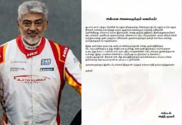 நடிகர் அஜித் குமார் வெளியிட்டுள்ள அறிக்கை:அன்பான அனைவருக்கும் வணக்கம்! துபாய் கார் பந்தய ரேஸின் போதும் நிகழ்வுக்கு பின்னரும் இப்போதும் எப்போதும் நீங்கள் எனக்கு கொடுத்து வரும் ஆதரவும் ஊக்கமும் எனக்கு மகிழ்ச்சி அளிக்கிறது. எல்லாம் வல்ல இறைவன், எனது குடும்பத்தினர், திரைத்துறையினர், ஊடகங்கள், அரசியல் தலைவர்கள், விளையாட்டுப் பிரமுகர்கள், நலம் விரும்பிகள் மற்றும் எனது அன்புக்குரிய ரசிகர்கள் அனைவருக்கும் நன்றி சொல்ல எனக்கு வார்த்தைகள் போதவில்லை.